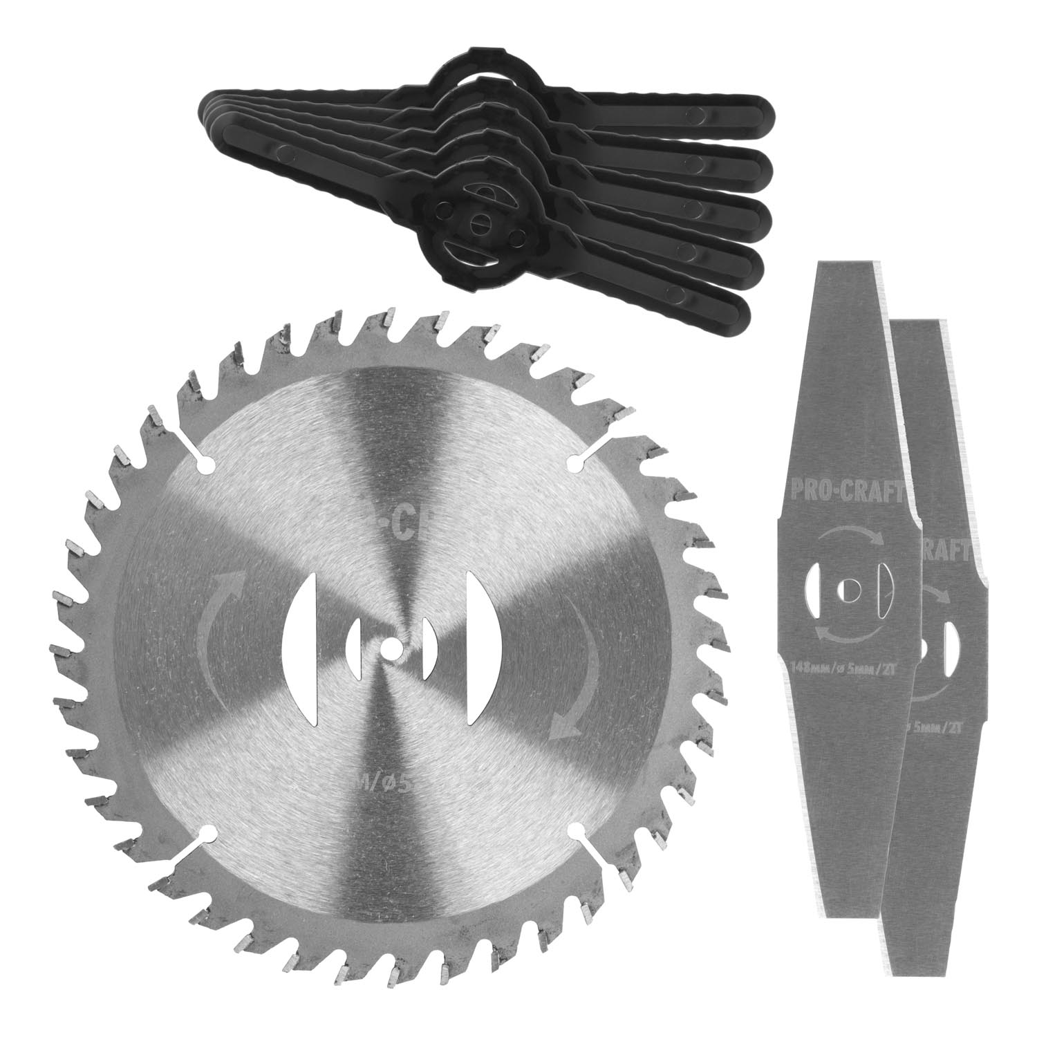Aku vyžínač Procraft PTA24 s teleskopickou rukoväťou a otočnou hlavou. Súčasťou balenia sú dve batérie 20V 2Ah, nabíjačka, 5 ks plastových čepelí, 2 oceľové nože a kotúč. Hmotnosť 1,7 kg, otáčky 5500-8000/min.