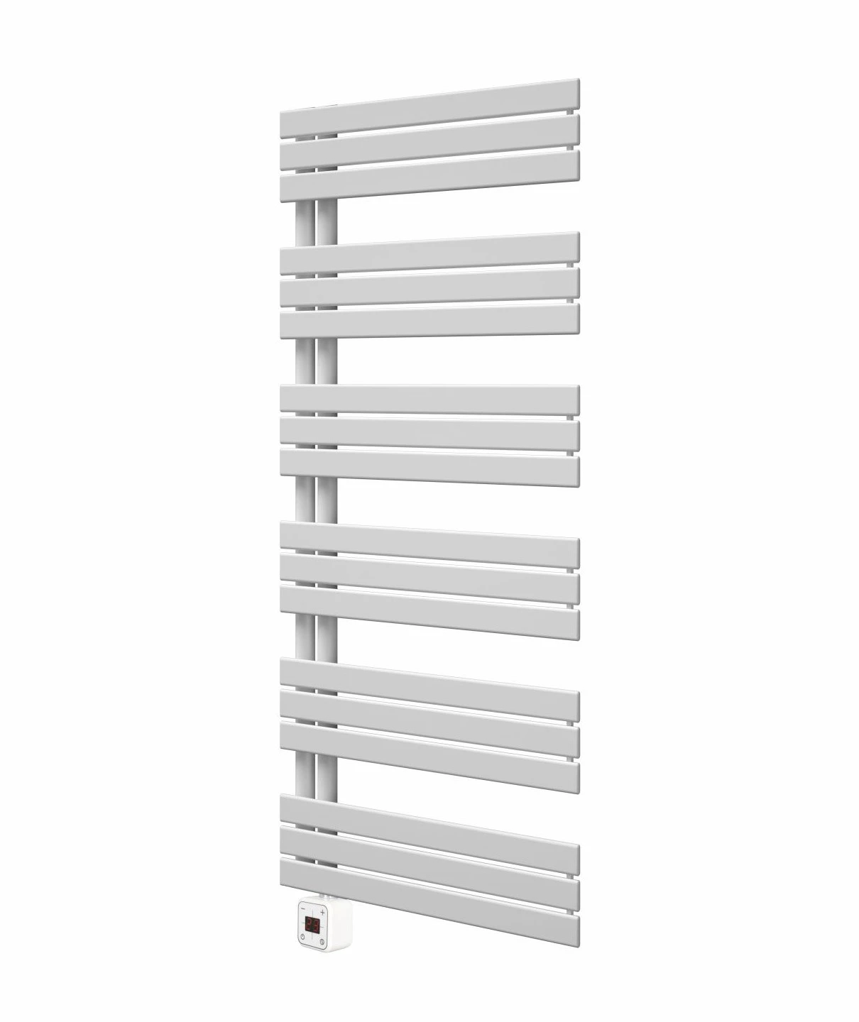 Elektrický radiátor, príkon 800 W, biela lesklá farba, zabudovaná ohrievacia tyč, elektronické ovládanie teploty, krytie IP44, LED displej, časovač, automatické vypnutie pri prehriatí.