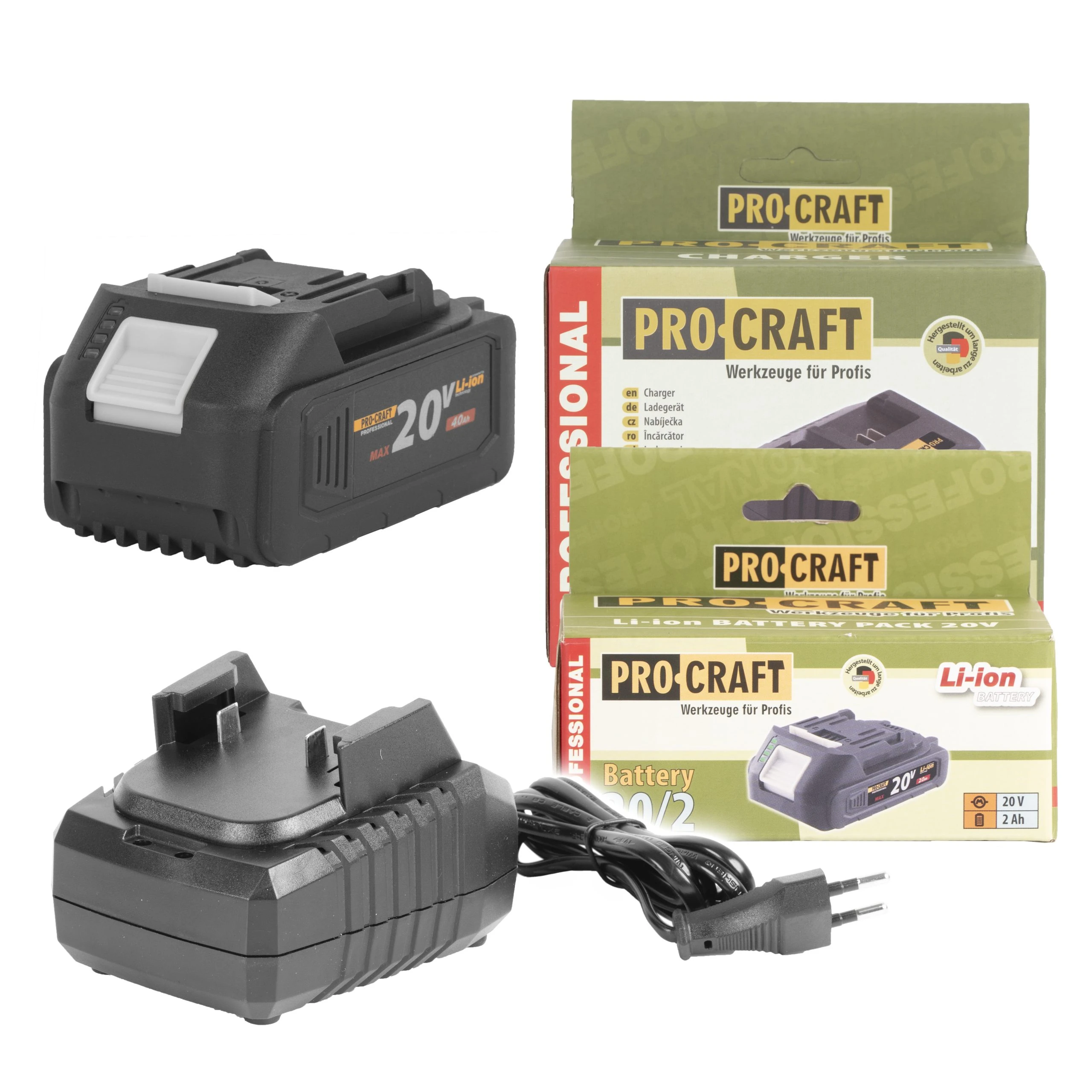 Batéria Procraft 20/4 Batéria: LI-ion 20V, 4Ah Čas nabíjania 0-MAX: 135 min + Nabíjačka pre 20V Li-ion batérie Procraft 20/1 ATA-40. Napájacie napätie: 230 V. Frekvencia: 50 Hz. Nabíjacie napätie akumulátora: 20 V.