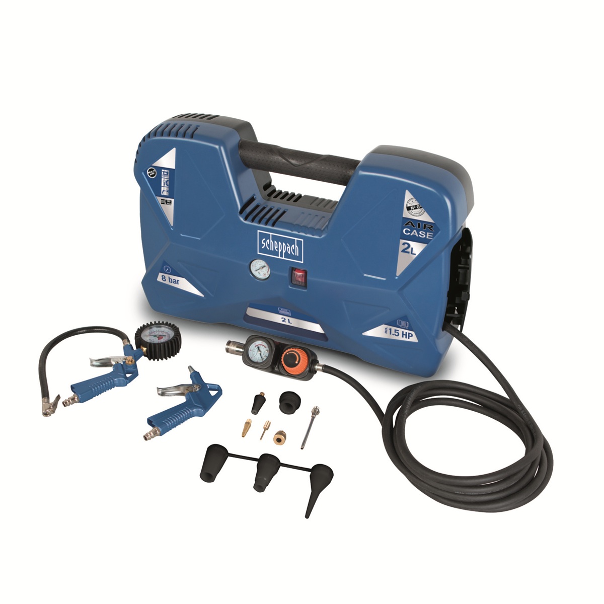 Malý, skladný, tichý, lehký, přesto ale výkonný a bohatě vybavený. Takový je tento skvělý kompresor Scheppach AIR CASE. Výborně se hodí do každé domácnosti, chaty, karavanu nebo malé dílny. Nadstandardní výbava zahrnuje vzdušník o objemu 2 l, díky kterému si dofouknete kolo ve sklepě i bez nutnosti přívodu elektřiny, 9 různých koncovek, díky kterým nafouknete vše od míče, přes pneumatiky a lehátka, až třeba po nafukovací bazén, 3 m hadici s integrovaným manometrem a ovladačem nastavení tlaku, praktickou ofukovací pistoli, integrované prostory pro uložení příslušenství i hadice, pohodlné madlo a manometr vzdušníku. Kompresor je vybavený nejmodernějším motorem s bezolejovou technologií, takže nikdy není potřeba kontrolovat hladinu oleje ani se starat o jeho stáří. Kompresor je tak vždy připravený odvést svoji práci. Jeho rozměry a nízká váha pouhých 8 kg ho rovněž předurčují k využití při stanování, kempování a jiných outdorových aktivitách.