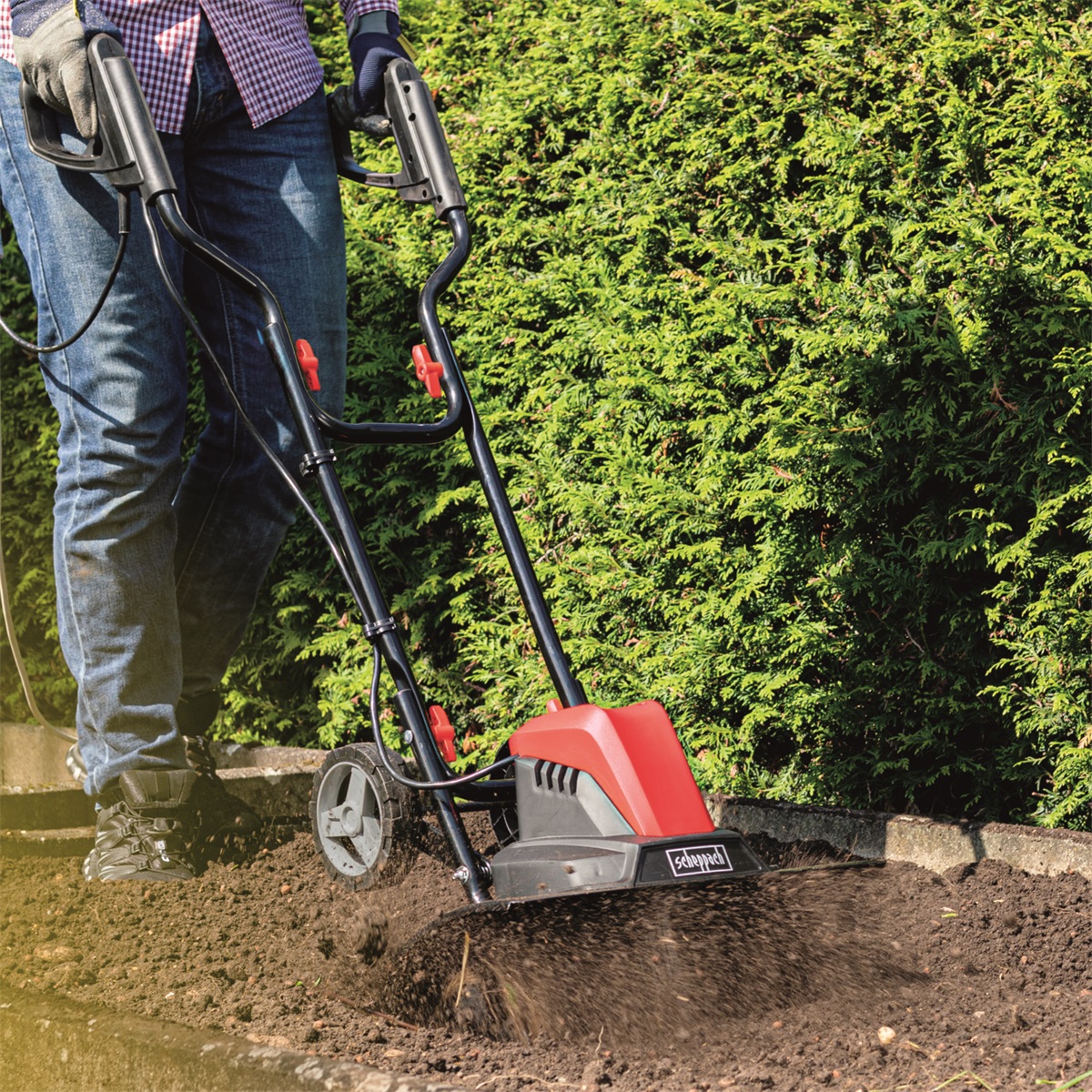 Elektrický kultivátor Scheppach MTE 460 je ideální pomocník pro přípravu půdy před výsadbou, kypření půdy, mělnění půdy po rytí, zapravování hnojiva, kompostu nebo rašeliny do hlíny. Díky svému záběru 45 cm je vhodný na menší až střední záhony, na přípravu půdy ve sklenících apod. Je vybaven 24 speciálně tvarovanými noži, silným motorem 1500 W, odolným kovovým rámem, kovovou převodovkou pro dlouhou životnost, ergonomickými rukojeťmi, háčkem na ukotvení elektrického kabelu a bezpečnostním spínačem. Pro snadný transport a skladování je vybaven horním madlem, přepravními kolečky a složitelnými řídítky. Díky své příznivé hmotnosti ho mohou snadno obsluhovat i ženy. Tichý chod motoru ho předurčuje i pro práci v hustěji zastavěných prostorech.