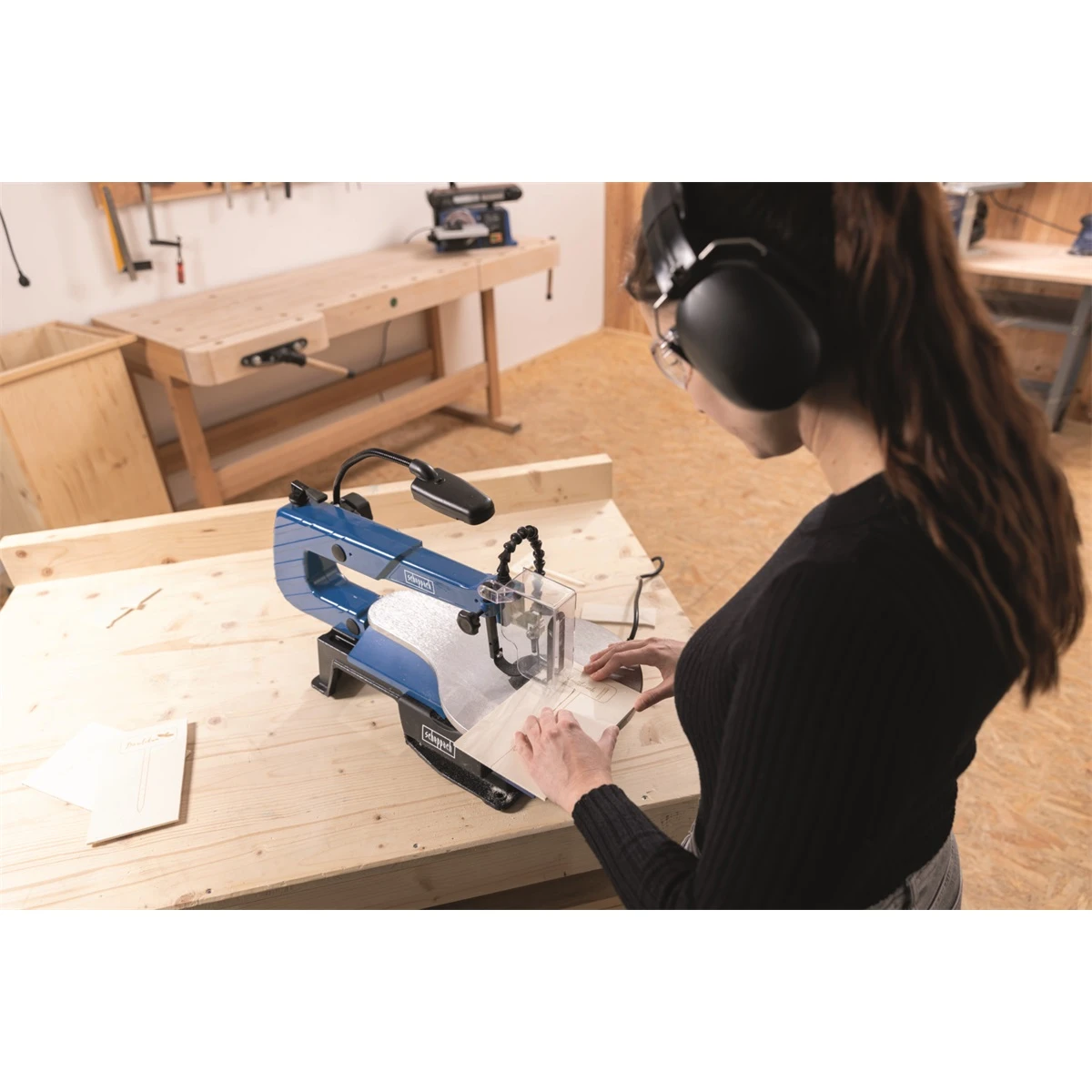 Lupínková pilka SD 1600 V od Scheppachu dovoluje provádět i velmi složité tvary řezů a je tak výborným doplňkem do mnoha domácích dílen, pro modeláře ap. Výkonný motor a nastavitelná rychlost jsou nezbytnou podmínkou pro práci s tak různými materiály, jakými jsou kovy, plasty, dřevo, plexisklo nebo sádrokarton. Základem přesného řezu je silné paralelní rameno a minimální vibrace stroje. Rovné řezy zvládne téměř kterákoliv pilka, ale pevnost celé konstrukce se ukáže právě při složitých řezech, které pilka Scheppach zvládá velice dobře. Aby měl uživatel perfektní přehled o dění na pracovní ploše, je bezpečnostní kryt vyroben z průhledného plastu. Navíc je stroj vybaven ventilátorem, který ze stopy řezu odfukuje piliny a umožňuje tak perfektní vizuální kontrolu řezu po celou dobu práce. Důležitým prvkem, velmi rozšiřujícím možnosti použití stroje, je naklápěcí funkce stolku v rozmezí 90° až 45° Velmi komfortním prvkem je naprosto snadný systém výměny pilového plátku. Systém uchycení navíc dovoluje využívat oba nejrozšířenější tvary pilového plátku. Pilka je rovněž vybavena odsávacím konektorem, LED osvětlením a úložným prostorem na pilové plátky