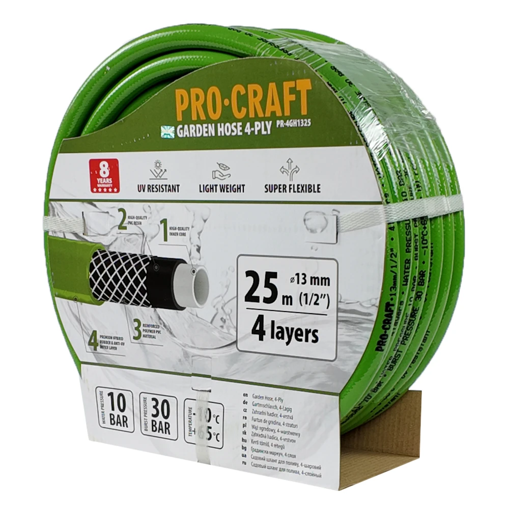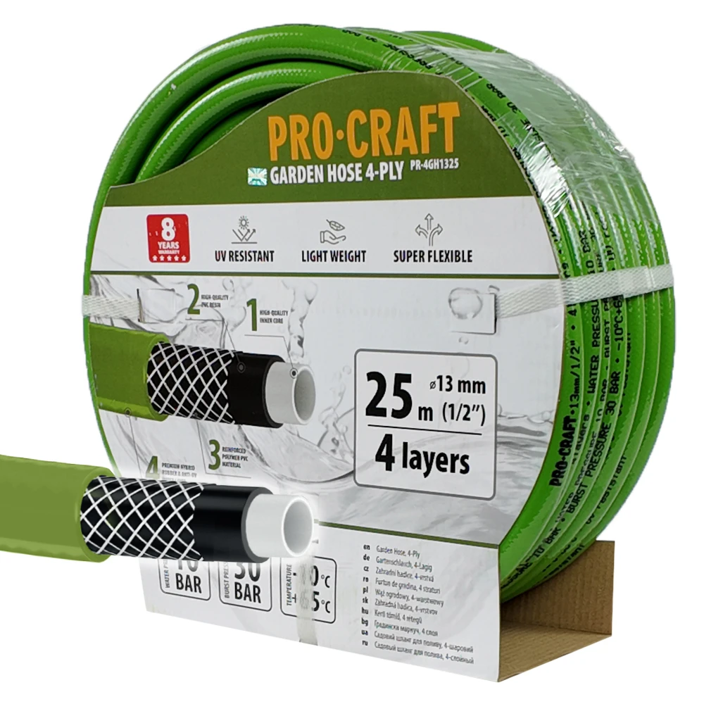 Záhradná hadica Procraft je určená na zavlažovanie a polievanie záhrad, pozemkov. Zosilnená 4-vrstvová záhradná hadica s tkanou výstužou má dlhú životnosť až 8 rokov. Kvalitné spracovanie hadice zaručuje vysokú odolnosť voči UV žiareniu, poveternostným vplyvom a teplotám (-10 až +65). Hadica je veľmi pružná, pevná a odolná voči poškodeniu.